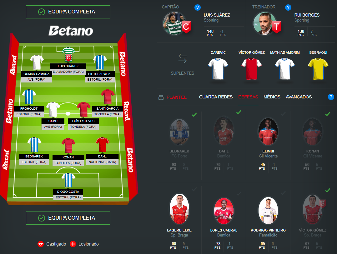 Bom dia Rui, podia disponibilizar a lista de castigados e lesionados sff? Obrigado e bom fim de semana